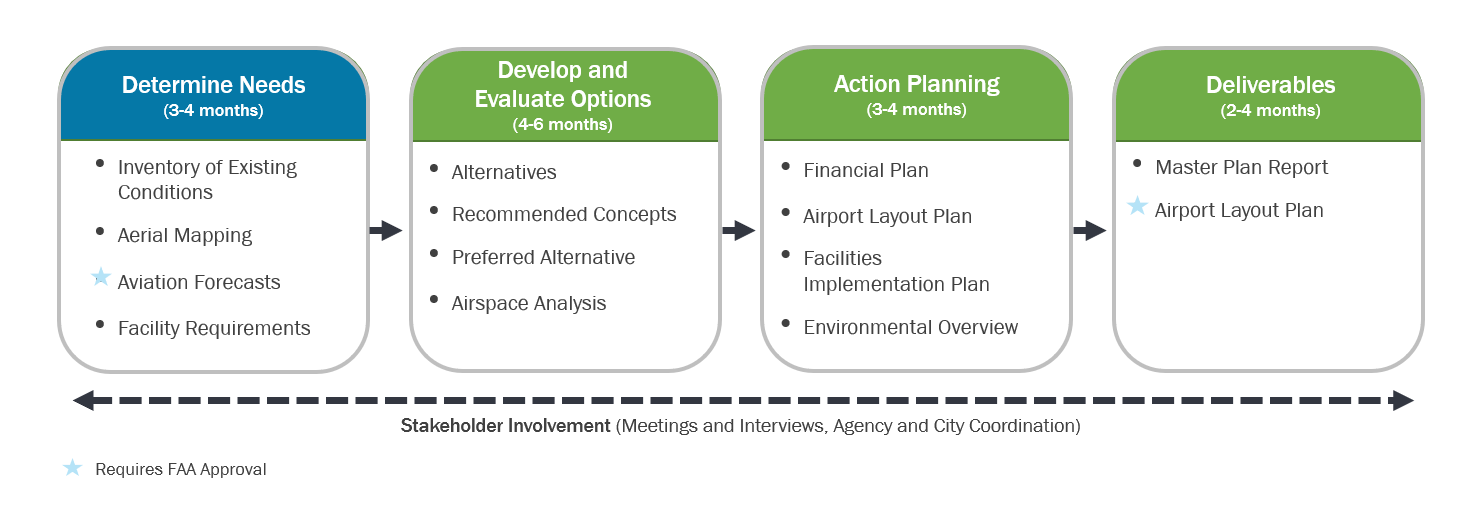 An airport master plan describes the long-term need for and timing of airport improvements over a 20-year horizon. A master plan update is recommended by the FAA every 8 to 10 years.